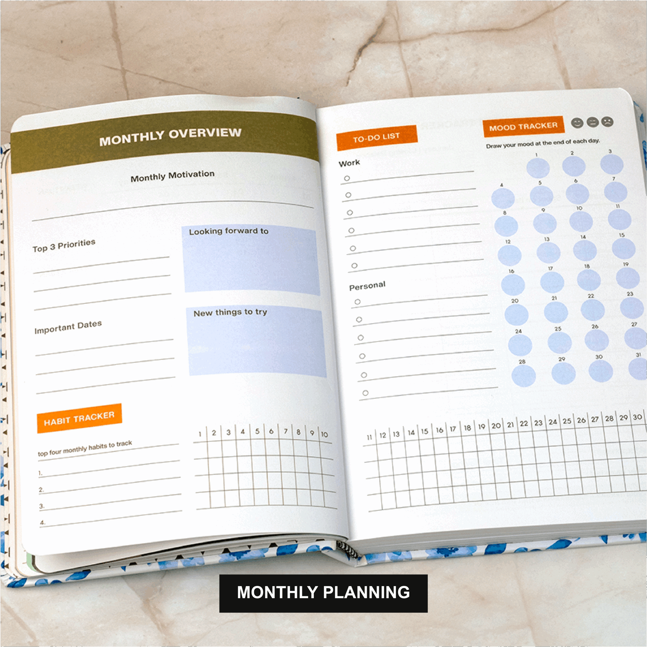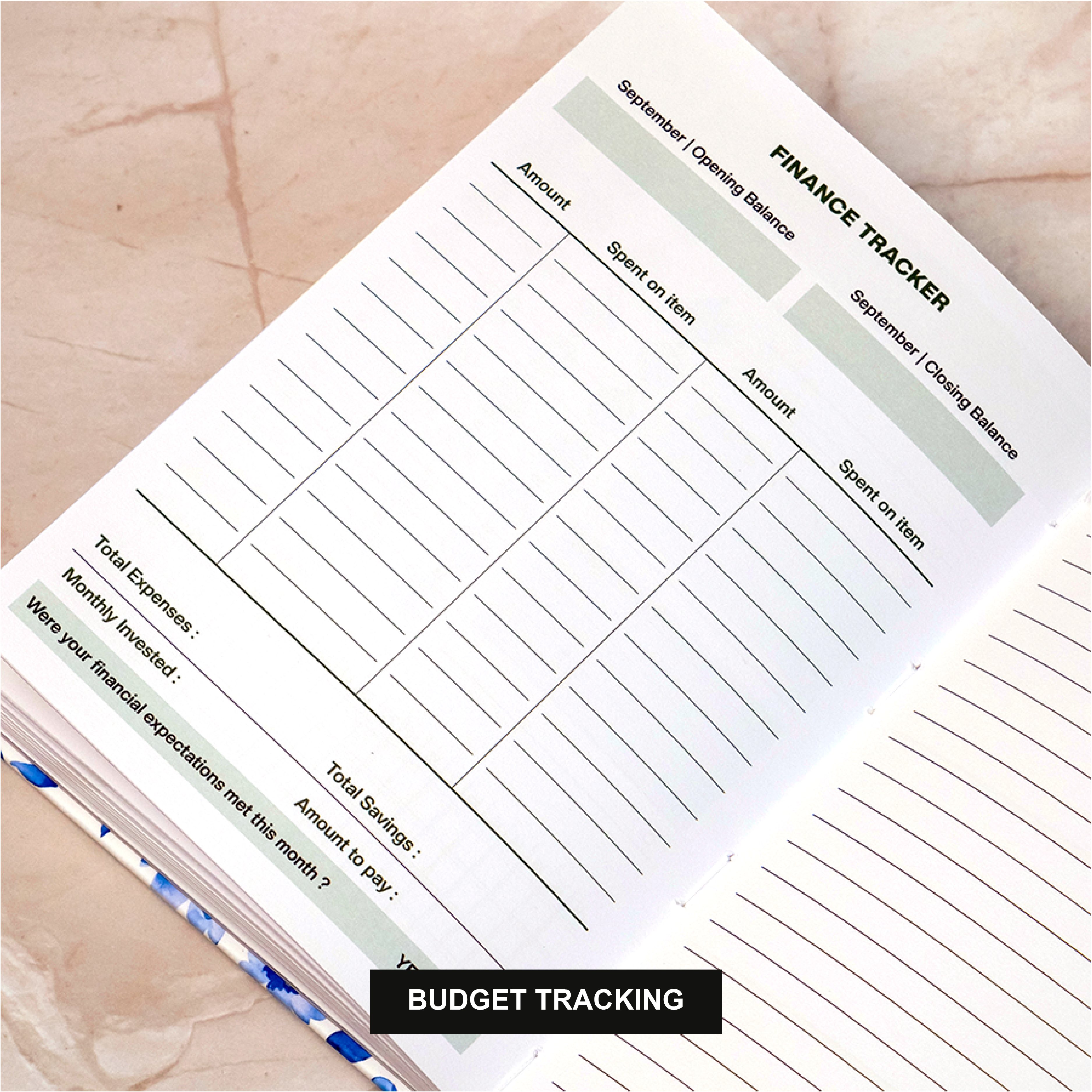 - Monthly habit, mood & budget tracking pages